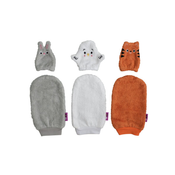 Inneholder 3 x vaskekluter i babystørrelse og 3 x vaskekluter i voksenstørrelse.